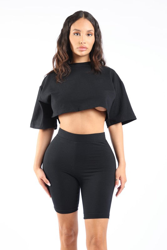 Solid short sleeve crop top and biker short set
