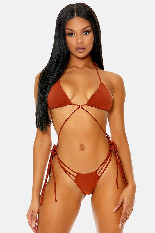 Top: Tie Closure2pc. Bikini set features halter triangle top with adjustable stomach ties that connect to multi side strap thong bikini bottoms.